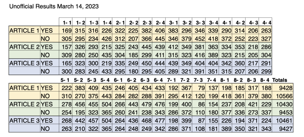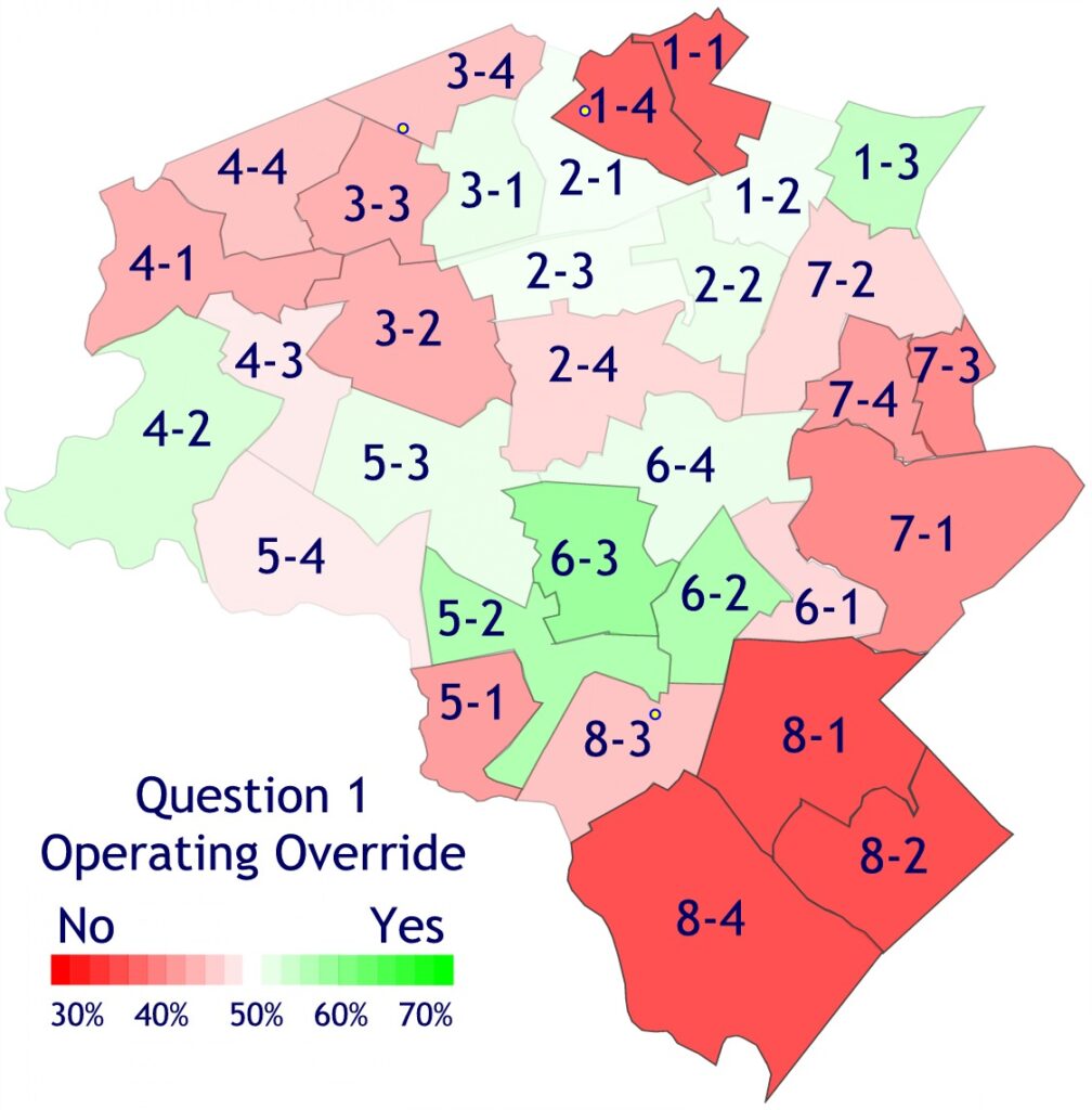 The “No” vote on the override was 10, 566 to 9,428. The two debt exclusions passed by almost exactly the same margin: 10,430 “Yes” to 9,453 “No” for Countryside and 10,461 “Yes” to 9,427 “No” for Franklin. Other observations:
