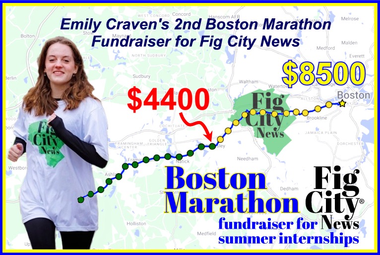 Emily Craven — Newton North HS ’22, now studying at University of Vermont — was the primary fundraiser for last year’s Fig City News summer internship program, and she’s back with a higher goal. On April 20, Emily will once again run the Boston Marathon to raise $8,500 for the Fig…