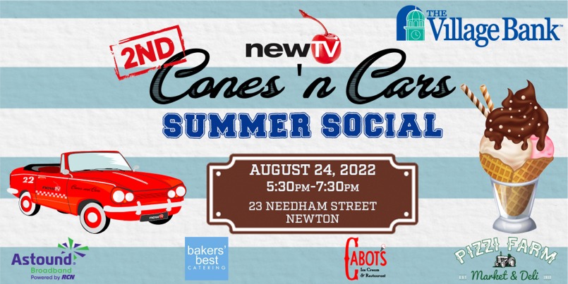 NewTV will host the 2nd annual Cones & Cars Summer Social on August 24, 5:30PM-7:30PM at 23 Needham Street. Classic cars will be on display, and there will be free ice cream and treats from Cabot’s, Bakers’ Best, Pizzi Farm, the Astound ice cream truck, and more. Admission is free…