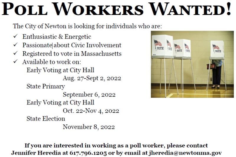 The City of Newton is hiring poll workers for upcoming elections and is looking for individuals who are enthusiastic, energetic, passionate about civic involvement, registered to vote in Massachusetts, and available to work on these dates: August 27 – September 2 (Early Voting at City Hall) September 6 (State Primary)…