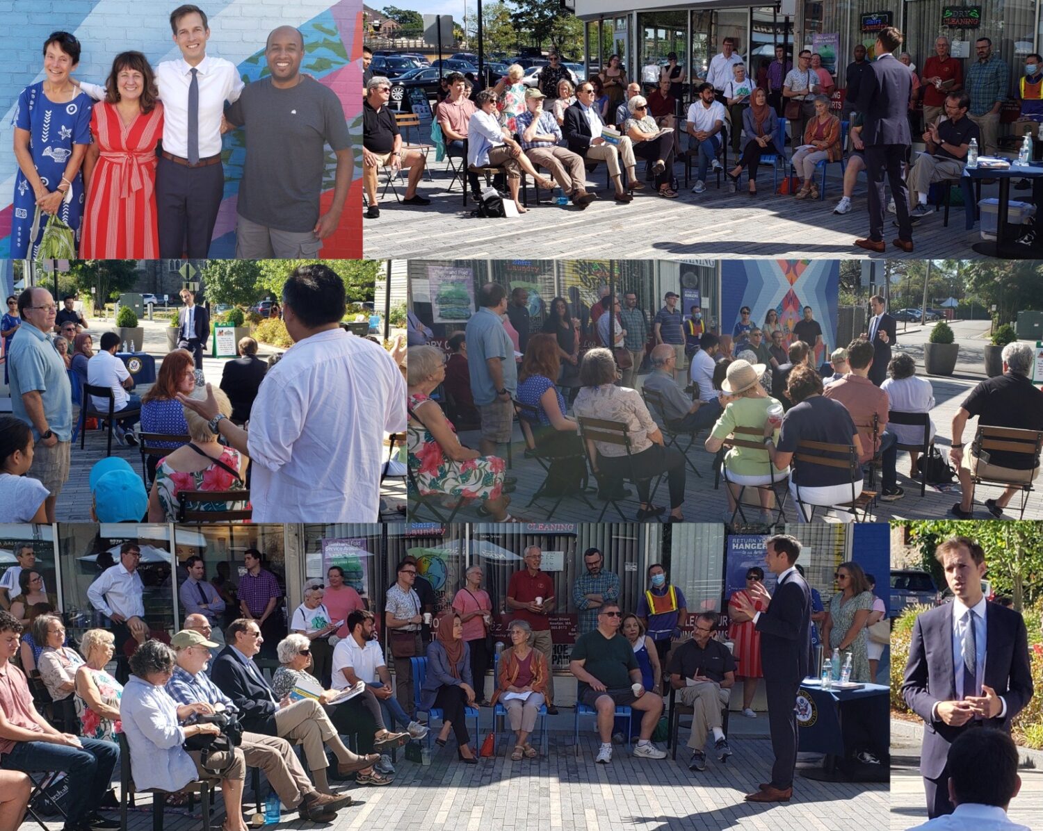 Congressman Jake Auchincloss met with approximately thirty people at a morning coffee in Newtonville on August 31. In a wide-ranging discussion, the Congressman — formerly City Councilor-at-Large from Ward 2 — expressed his support for Federal spending to implement or strengthen state environmental, economic, energy and health care programs. He affirmed his commitment — and vote for — offshore wind, promising to put wind turbines along the south coast of Massachusetts to boost energy, protect the environment, and create jobs. While the Congressman’s focus is to promote non-fossil fuel energy alternatives, he lamented the fact that his Congressional colleagues are not fighting hard enough to eliminate carbon emissions. The Congressman is a proponent of nuclear energy, noting that MIT is working on a project that would create energy via fusion, which does not yield radioactive waste — still a problem with energy produced via nuclear fission.
