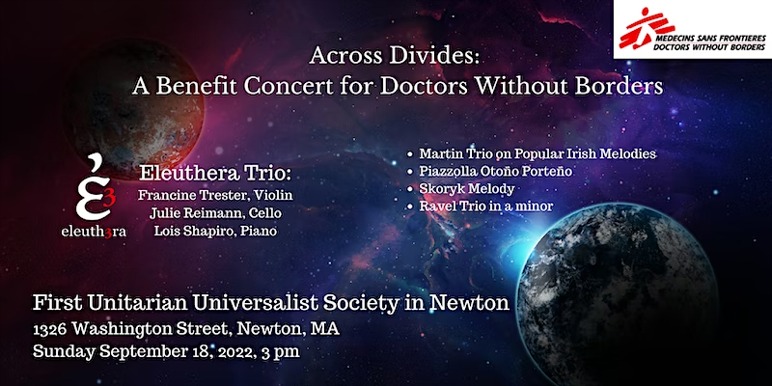 Boston-based Eleuthera Trio (Lois Shapiro, piano; Francine Trester, violin; Julie Reimann, cello) will perform ‘Across Divides’ on Sunday September 18 at 3PM at the First Unitarian Universalist Society in Newton (1326 Washington Street). Tickets/donations can be made at the door or online. The concert benefits Doctors Without Borders — a nonprofit assisting victims of conflict, natural disasters, epidemics and healthcare exclusion — particularly in support of their work in Ukraine and Afghanistan. The concert program evokes folklore of Ireland, Argentina, the Ukraine, and Basque country: Frank Martin’s scintillating Trio on Popular Irish Melodies, Astor Piazzolla’s exciting Otoño Porteño, Ukrainian composer Myroslav Skoryk’s hauntingly beautiful Melody, and Maurice Ravel’s exquisite Trio in A minor.