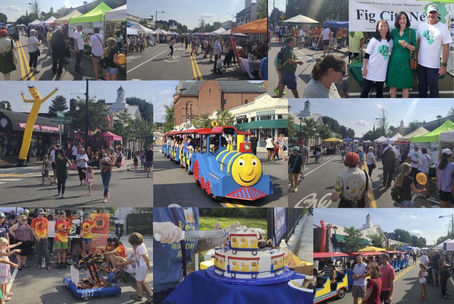 Sunday was beautiful and fun, and Newtonville Village Day was a huge success, with a steady stream of people from the village and all parts of Newton. This year offered a much broader range of vendors, bolstered in part by the newer restaurants in the village. There were more activities — including artists, face painting, and a train provided by the Masons — and opportunities to meet the LigerBots and their robot and Newton’s very friendly Officer Leo. Village Day organizers Dana D’Agostino and Maura Harrington noted that attendance was much higher than last year, and the 300 Village Day T-shirts they brought were gone by 2PM. We at Fig City News very much enjoyed meeting so many people in person, and we were glad to see that Fig Newtons remain very popular!