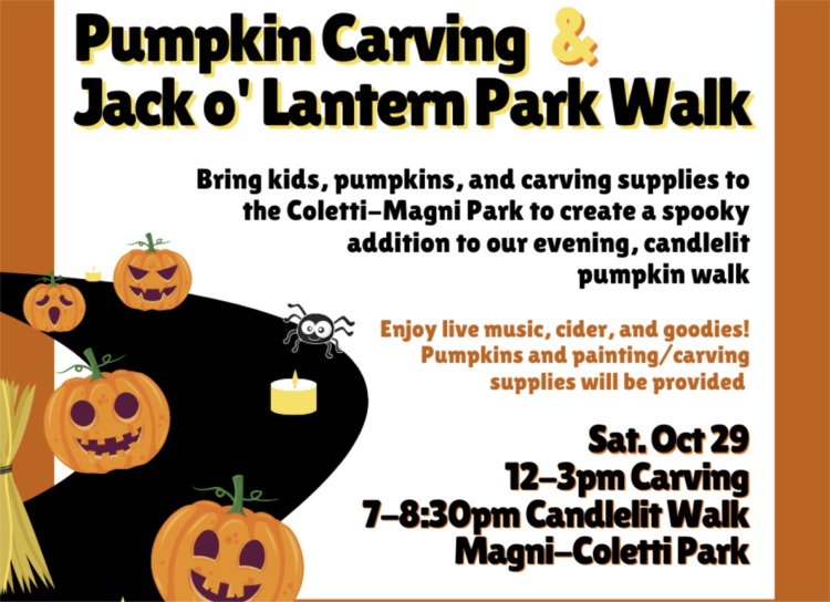 On October 29, noon-3PM, the Friends of Coletti-Magni Park will offer pumpkin carving and painting, live music, and cider, followed by a Jack O’Lantern Walk, 7PM-8:30PM at Coletti-Magni Park.