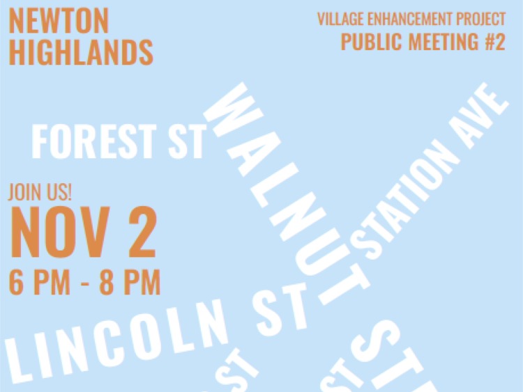 Newton’s Department of Public Works will hold an online meeting (Zoom link) on November 2, 6PM-8PM, to summarize the community feedback it has received about the Newton Highlands Project and to gather further community input on the initial design alternatives for the village center. See flyer.