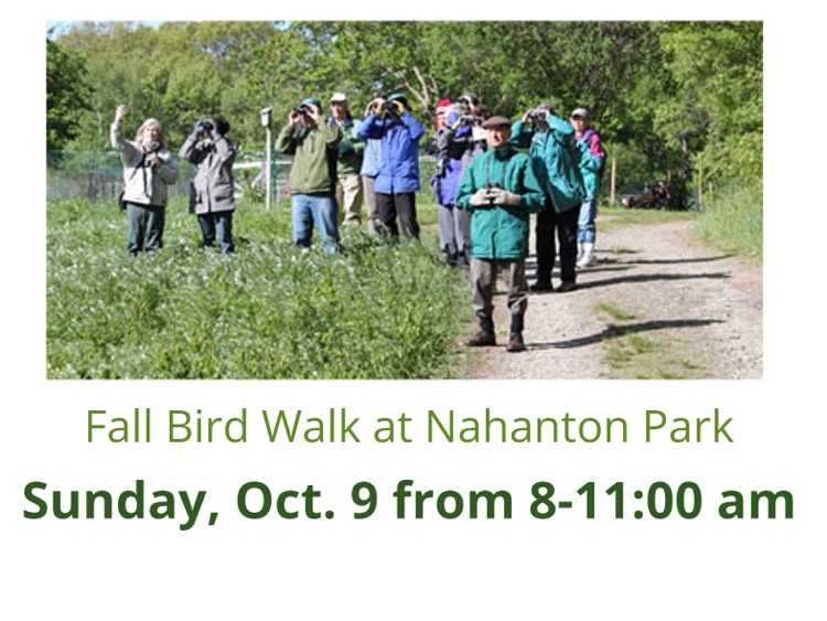 The Friends of Nahanton Park are sponsoring a Fall Bird Walk at Nahanton Park on Sunday, October 9, 8AM-11AM, free and open to the public. Meet at the parking lot at the meadow near the community gardens off Winchester Street. Long time birder Haynes Miller will guide the walk. Waterproof shoes recommended. Bring a water bottle, binoculars, and dress for the weather. Cancelled in case of steady rain.