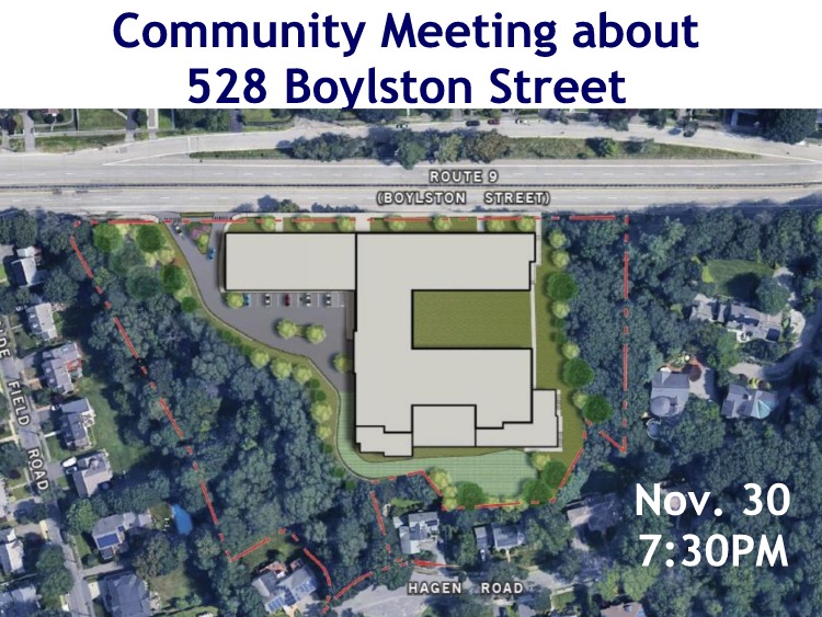 A community meeting is scheduled for TONIGHT, Wednesday, November 30 at 7:30PM regarding the proposed development of 528 Boylston Street. It will be held in-person (Newton South High School, 140 Brandeis Road) and virtually (Zoom link). The 528 Boylston Street proposal calls for a 5-7 story, 244-unit housing development at…