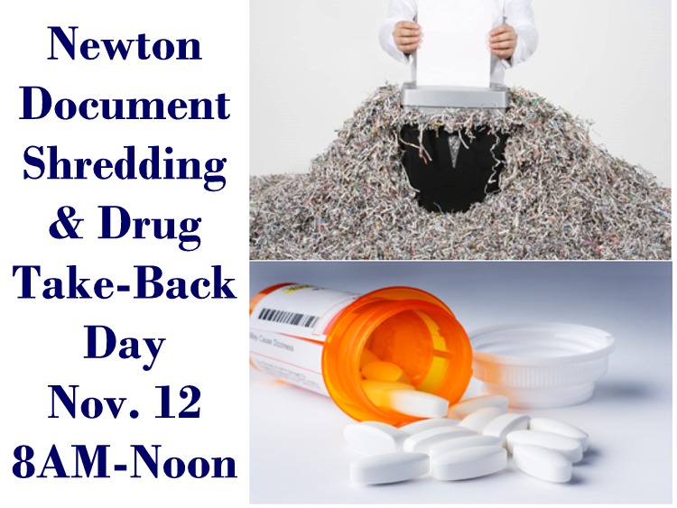 The Newton Resource Recovery Center on Rumford Avenue will hold a Document Shreddig & Drug Take-Back Day on November 12, 8AM-Noon. Advance sign-up (by calling City Hall at 617-796-1000) is required. It’s a drive-through event, so stay in your car. There is no cost, but $10 donations are appreciated — mailed to the Senior Center (345 Walnut Street, Newtonville 02460), by credit card online, or by cash or check at the event.