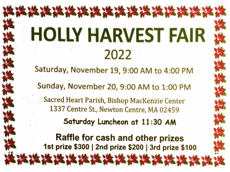 The Guild of St. Francis, Parishes of Sacred Heart and Our Lady’s, Newton Centre-West Newton/Nahanton will present its Holly Harvest Fair in the parking lot of the Bishop MacKenzie Center (1337 Centre Street, Newton Centre) on November 19 (9AM-4PM) and November 20 (9AM-1PM). Some features: Luncheon on Saturday at 11:30AM, a Raffle for cash and other prizes, Holiday Table, Toy Shops, Silent Auction, Plants, Knits, Gifts, Gift Baskets, Baked Goods, Frozen Holiday Pies, Children’s Activities, Grandma’s Attic, and more! For more information contact Barbara Hatem at 617-969-2567 or [email protected].