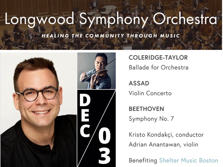 The Longwood Symphony Orchestra will present a concert of Coleridge-Taylor, Assad, and Beethoven on December 3 at 8PM in New England Conservatory’s Jordan Hall with guest conductor Kristo Kondakci and violin soloist Adrian Anantawan. The concert will benefit Shelter Music Boston, which brings music to homeless shelters and substance misuse centers. Mr. Anantawan is also the Artistic Director of Shelter Music Boston. The LSO’s musicians are primarily healthcare professionals, and Newton residents in the LSO include Dr. Michael Barnett (oboe, internal medicine), Dr. Shirie Leng (violin, anesthesia), Dr. Richard Parker (violin, internal medicine), Dr. Lisa Wong (violin, pediatrics), and Dr. Stephen Wright (bassoon, gastroenterology). Buy tickets here.