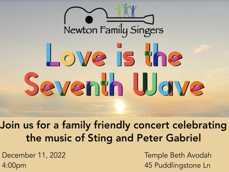 The Newton Family Singers will present their Fall 2022 concert — Love is the Seventh Wave –featuring the music of Sting and Peter Gabriel on December 11 at 4PM at Temple Beth Avodah (45 Puddingstone Lane). It’s family friendly and their first in-person concert in two years! Tickets bought online are $12 adults, $10 kids — and at the door they are $15 for adults, $12 for kids.