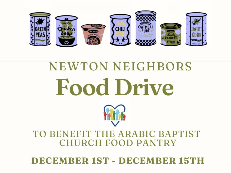 Newton Neighbors is holding a food drive to benefit the Arabic Baptist Church Food Pantry. Please drop off nonperishable foods — including cereal, pasta, rice, canned tuna, canned vegetables and fruit, and other similar items — at any of these drop-off locations: