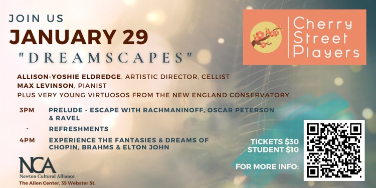 Allison-Yoshie Eldredge, Artist-in-Residence of The Allen Center, will host another Classical With a Twist concert there (35 Webster Street) on January 29 with the Cherry Street Players. The concert –with Max Levinson on piano, Allison-Yoshie Eldredge on cello, and New England Conservatory Prep School prodigies — will start at 3PM with a Prelude Recital, followed at 4PM by Dreamscapes featuring music by Chopin, Brahms, and Elton John. Dreamscapes is a conversation between artists, special guests, and audience members, showcasing great classical music with socially-relevant culture. Tickets here.