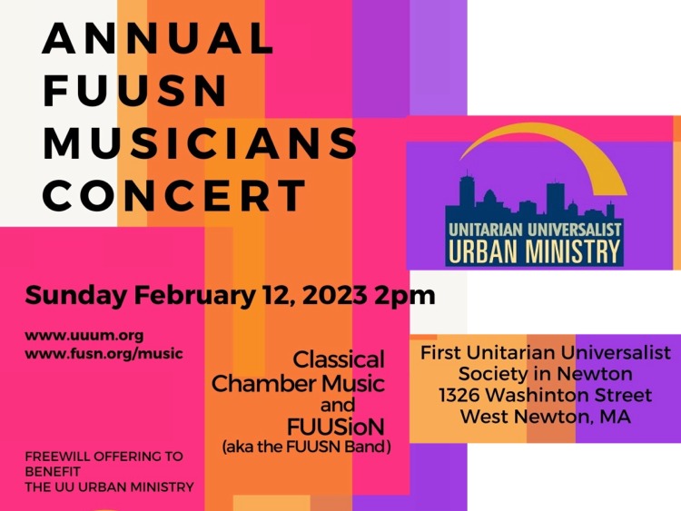 Come and hear the wonderful musicians of the First Unitarian Universalist Society in concert on Sunday, February 12, 2023 at 2PM in the FUUSN Sanctuary (1326 Washington Street). This year’s concert is a fundraiser for the UU Urban Ministry. You’ll hear renowned pianist Lois Shapiro, professional saxophonist and composer Geoff Wadsworth, and the…