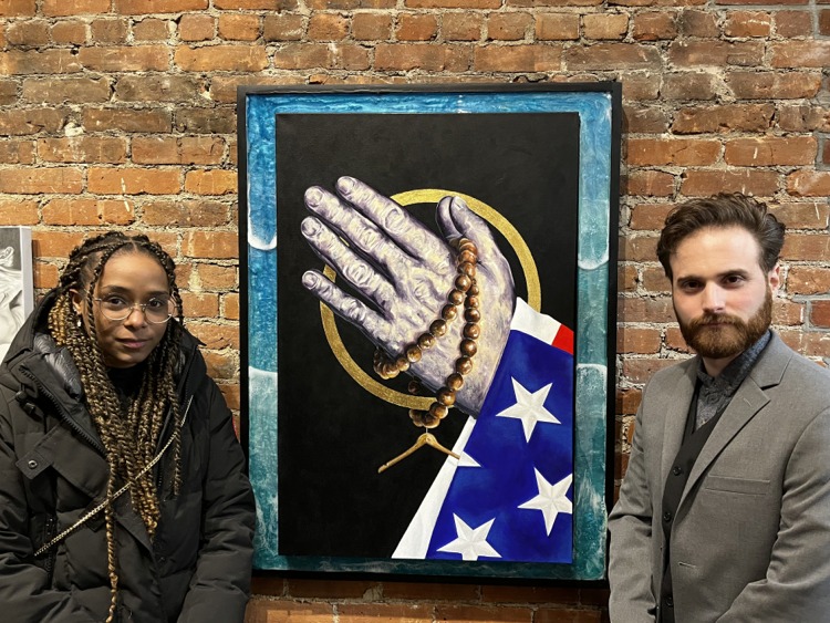 Fernando Fula, from Boston, has two pieces in the “This is America” exhibit. His painting “Thoughts & Gov,” shows a hand reaching out as if in prayer draped in an American flag. In a novel twist, artist Alex Martinez created the blue frame which surrounds the painting. Fula’s second piece, “I Don’t Understand America,” features a person gazing out towards the distance, their eyes blank and white.