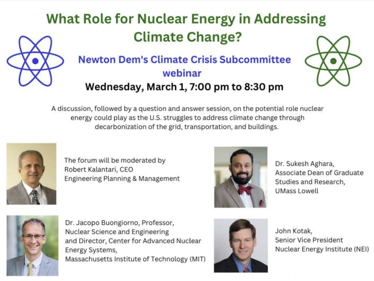 On March 1 at 7PM, the Climate Crisis subcommittee of the Newton Democratic City Committee will present What Role for Nuclear Energy in Addressing Climate Change?, a public forum on the potential role that nuclear power could play as the U.S. struggles to address climate change through decarbonization of the…