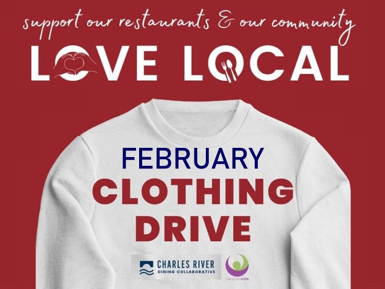 In parallel with its dining campaign, Charles River Regional Chamber’s Dining Collaborative is organizing a month-long clothing drive to benefit Circle of Hope, a Needham-based nonprofit that provides homeless children, women, and men in Boston and Metro West with clothing and necessities. Drop off — at any of these restaurant locations — NEW sweatshirts, sweatpants, t-shirts…