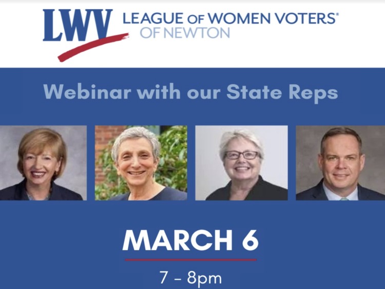On Monday, March 6, 7PM-8PM, the League of Women Voters of Newton will host a conversation with our four state legislative representatives – Senator Cynthia Creem, Rep. Ruth Balser, Rep. Kay Khan, and Rep. John Lawn. They will be sharing their thoughts on legislation they are following and efforts they are…