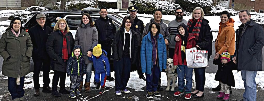 L-R: Natalia Jaimes, Peter Bernstein, Marilyn Bernstein, Vesi O’Leary with Mikey and Alex O’Leary, Officer Juan Garcia, Pip Jaramillo, Sgt. Hagai Brandon, Mateo Jaramillo, Officer Justin Lau, Officer Leo!, Aaron Sorrell, Nate Sorrell, Maureen Forry-Sorrell, Rue Roy, Ioanna-Narayani Sourlas, Nondas Sourlas.