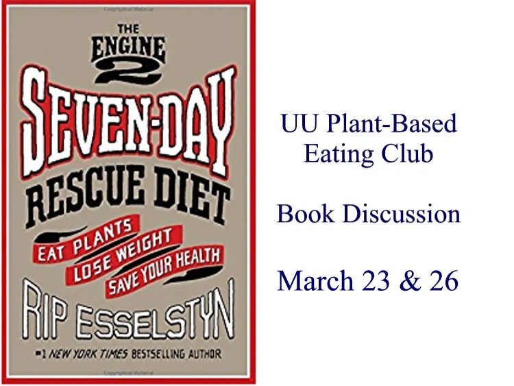 The UU Plant-Based Eating Club, housed at the First Unitarian Universalist Society in Newton (FUUSN), will host two discussions of the book The Engine 2 Seven-Day Rescue Diet: Eat Plants, Lose Weight, Save Your Health, by Rip Esselstyn. It’s about how a group of firefighters in Texas tried plant-based eating in order to improve their health. The results may surprise you, and the book contains a many healthy, easy-to-make, plant-based recipes. Following the discussions, some participants will embark on the 7-day rescue diet together!