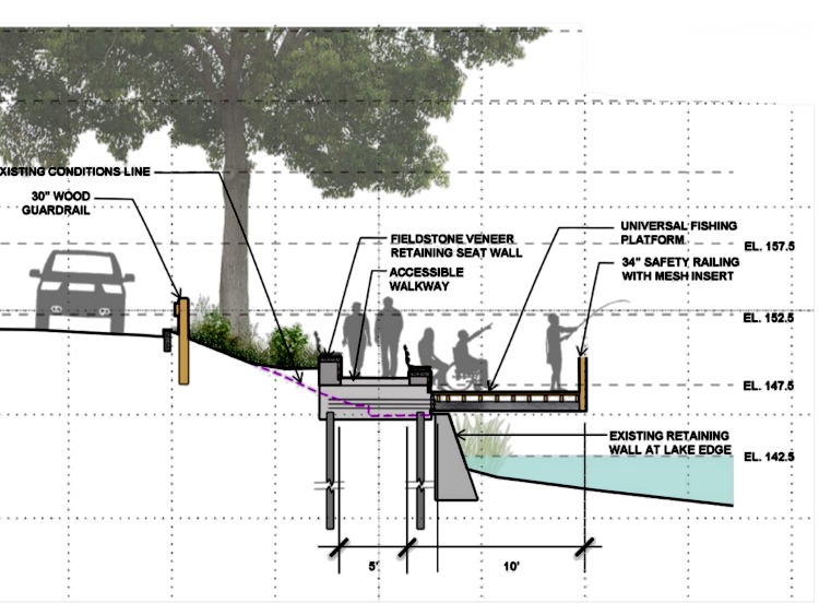 On the agenda at a recent meeting of the Newton Highlands Neighborhood Area Council were updates on the Levingston Cove and Crystal Lake projects. Luis Demorizi, Open Space Coordinator for Newton Parks, Recreation & Culture, reported that work on Levingston Cove is projected for completion in June, weather permitting. Newton Highlands Area Councilor Amy Wayne asked about the fishing deck at Levingston Cove and expressed concern that children might not be seen if they were to go under it. Mr. Demorizi said the fishing deck will extend ten feet from the wall and will be about thirty feet wide. In addition, the platform will be a few feet higher than the previous fishing wall, since the design called for raising the site. Mr. Fizek noted that the final project was controversial, with many feeling the project was “over-designed” and more expensive than it needed to be.