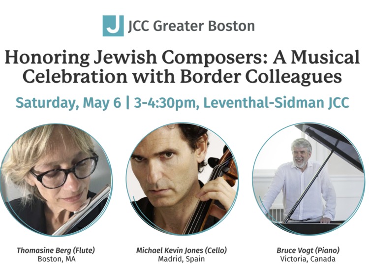 JCC Greater Boston will present A Musical Celebration Honoring Jewish Composers featuring the international trio, Border Colleagues, on May 6, 3PM-4:30PM at the Leventhal-Sidman JCC. Border Colleagues is a collaboration of three virtuosic musicians who connect across geographic boundaries to celebrate music-making together: Thomasine Berg (flute) in Boston; Michael Kevin Jones (cello) in Madrid, Spain; and Bruce Vogt (piano) in Victoria, Canada. They will play music by renowned Jewish composers, including Felix Mendelssohn, Ernest Bloch and George Gershwin. For ages 12+. Tickets are $15 ($10 for JCC members). Register here.