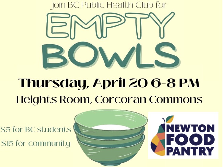 The Boston College Public Health Club is holding an Empty Bowls event to benefit the Newton Food Pantry on April 20, 6PM-8PM in a new venue: Heights Room, Corcoran Commons (2nd floor of Lower dining hall), Boston College. The event will raise awareness about food insecurity and bring the community together to support a local nonprofit that provides food for those in Newton in need. Purchase a ticket ($15, or $5 for BC students) — either beforehand by Venmo or at the door. At the event, learn about food insecurity and enjoy soup in a homemade bowl that you can keep (donated by other members of the community).