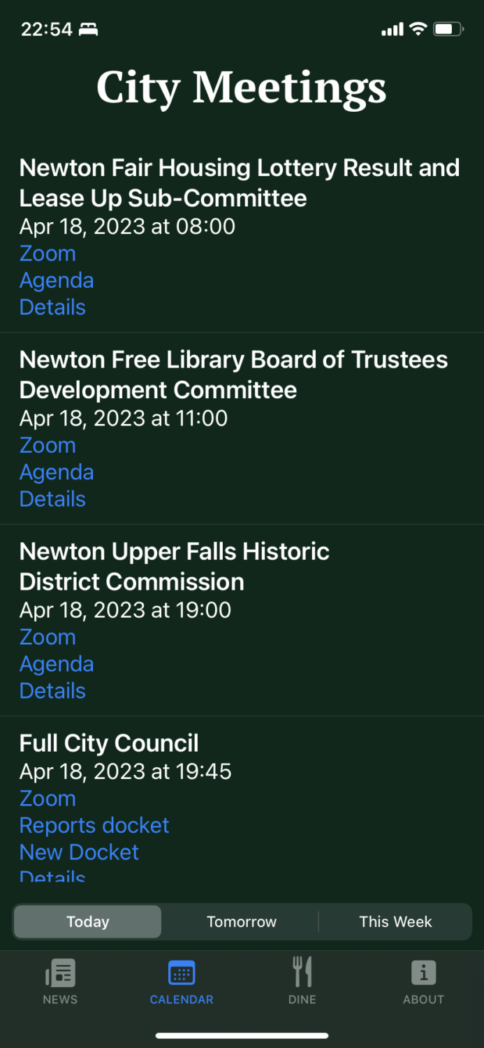 Choose “Today,” “Tomorrow,” or “This Week” to get a compact list of all City meetings along with direct links to each meeting’s Zoom link, agenda, dockets, and other details.