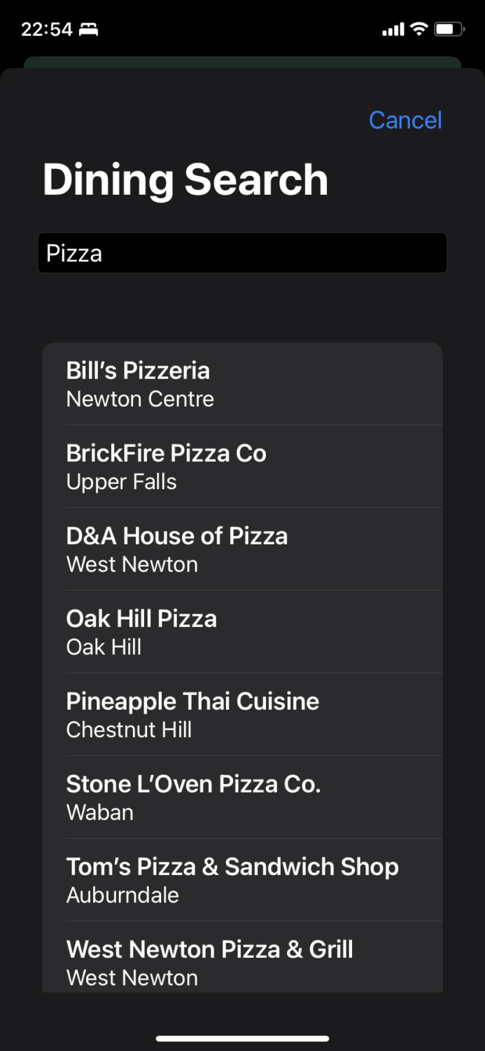 In addition to letting you “spin” to be presented randomly with one of 126 restaurants in Newton, you can now also easily search the list with a short (typo-tolerant) snippet of the name. The spin feature also allows you to go back through earlier establishments shown if you change your mind.