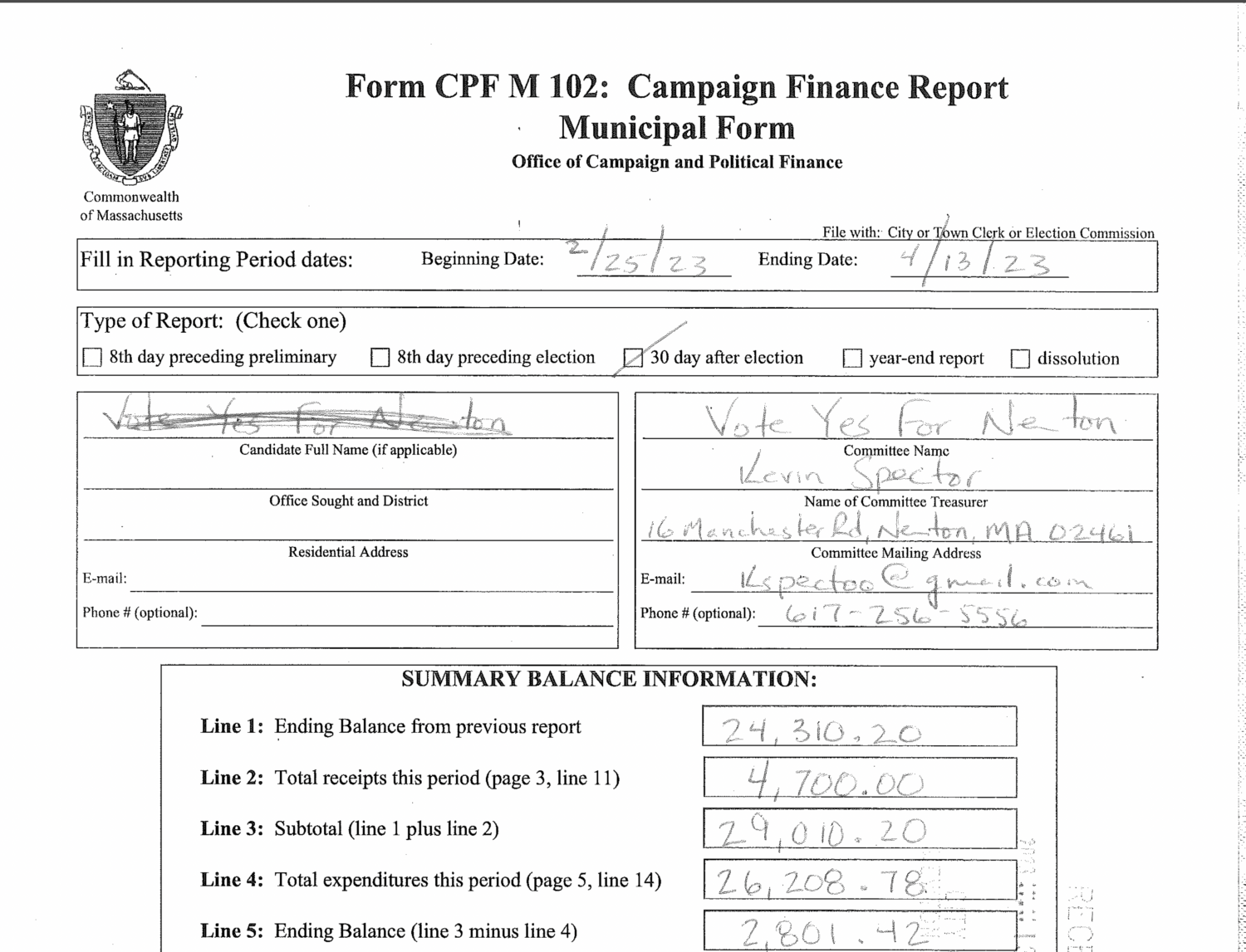 Vote Yes for Newton filed its 30-day post-election campaign finance report at City Hall on Thursday. The report shows the group raised an additional $4,700 since the February 24 ending of its pre-election report. Newton Mayor Ruthanne Fuller and her husband together contributed $2000 of the additional funds raised, in four separate $500 contributions. Overall the Mayor and her husband contributed $6,000 (12.5%) of the funds raised over the course of the pro-override effort.