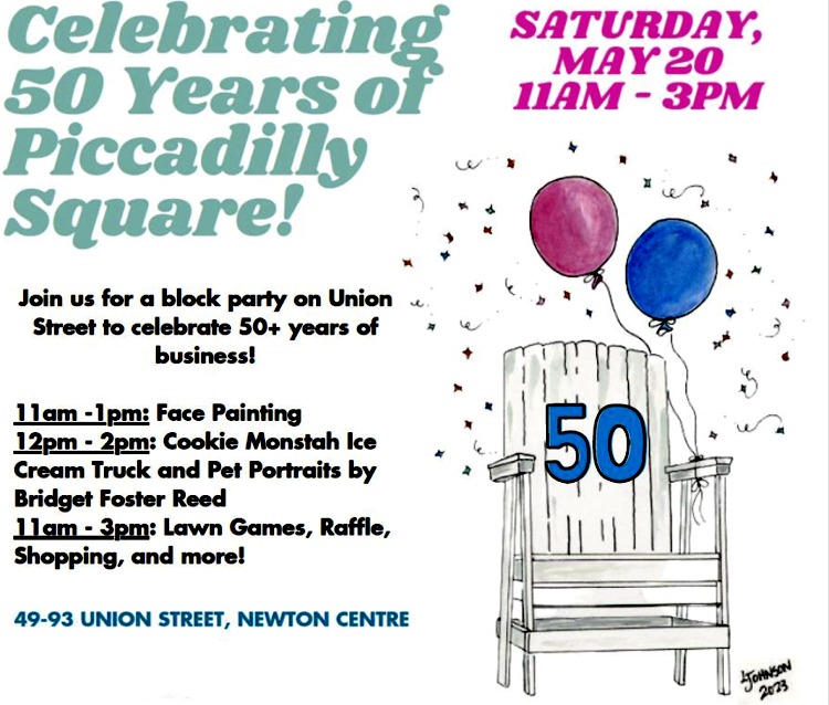 On May 20, a block party on Union Street in Newton Centre will celebrate the 50th anniversary of Piccadilly Square. The street will be pedestrian-only, 11AM-3PM, to make room for lawn games, shopping, a raffle, face painting (11AM-1PM), Cookie Monstah ice cream truck (noon-2PM), pet portraits by Bridget Foster Reed (noon-2PM, and more.