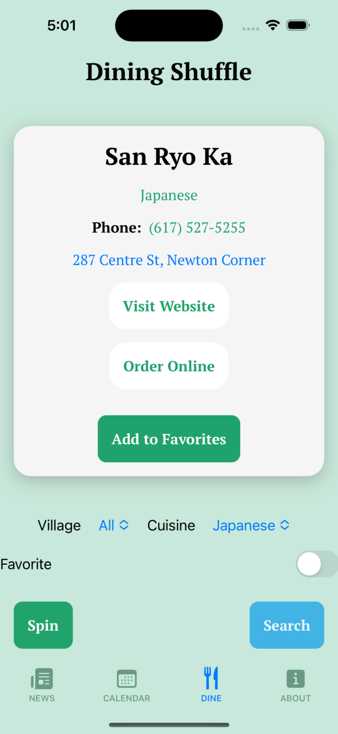 A month after its launch, the Fig City News app now offers a database of 139 places to eat in Newton. You can filter the list by village, by type of cuisine, and by your tagged favorites. And you can search by name or click “spin” to get a suggestion at random from your filtered list. Or browse them all. And then have ready access to the restaurant’s phone, address, directions, website, and ordering links.
