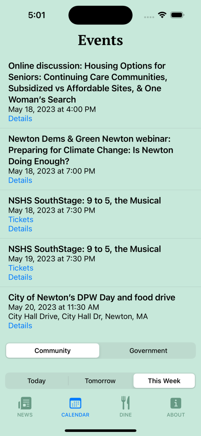 So this Thursday, around 7PM, you could check the app’s Local Government calendar, see the Public Safety and Transportation Committee meeting, and click to join in by Zoom. Or you could check the app’s Community calendar and see that you have just enough time to get over to Newton South HS to catch the opening night of SouthStage’s production of 9 to 5, the Musical.