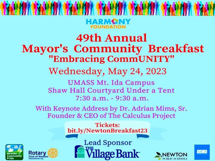 The event is organized by The Foundation for Racial, Ethnic and Religious Harmony (The Harmony Foundation), the Mayor’s Office, Newton Community Pride, the Newton Interfaith Clergy Association, the Rotary Club of Newton, and the Newton Public Schools. The Village Bank is lead sponsor. For more information, email [email protected]