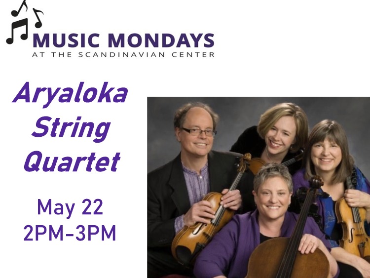 Music Mondays is a women-run nonprofit presenting frequent, live music concerts in the Scandinavian Living Center’s Nordic Hall to audiences of mostly senior citizens. On May 22, 2PM-3PM, the concert will feature the Aryaloka String Quartet of Boston — Beth Welty and Mark Latham, violins; Noralee Walker, viola, and Sandi-Jo Malmon, cello — performing works by four Black composers: Samuel Coleridge-Taylor, Florence Price, Coleridge-Taylor Perkinson and Jessie Montgomery.