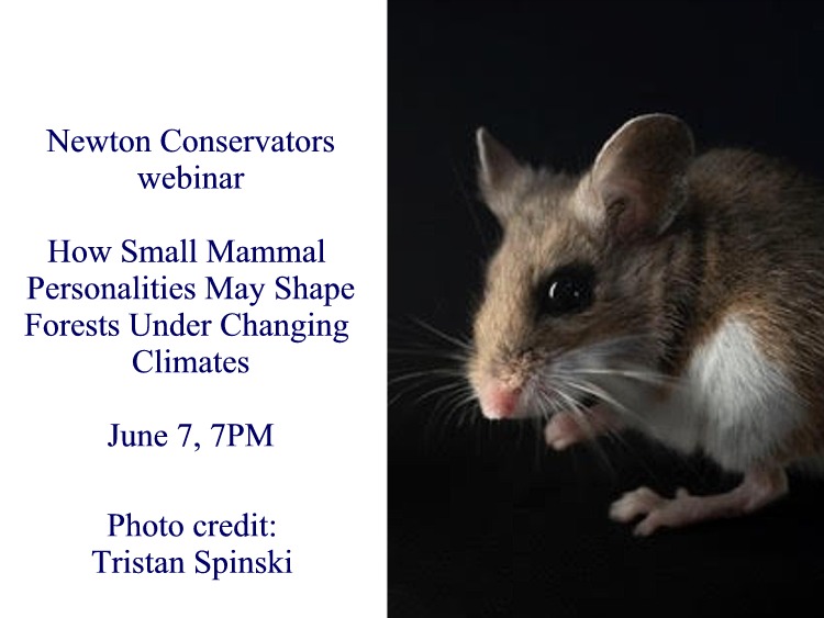 The Newton Conservators will host a webinar, How Small Mammal Personalities May Shape Forests Under Changing Climates, on June 7 at 7PM. Register here. Maine graduate student Ivy Yen will speak about her research, covered in the New York Times, about how the small mammal personalities (whether they are shy or bold) differentially select and cache seeds to influence future forest regeneration. She will explain that it takes a range of personalities to maintain forests.