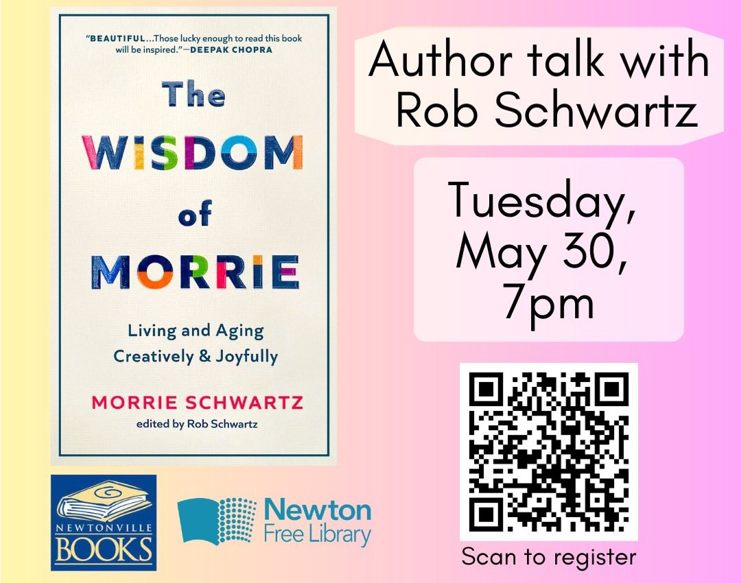 Rob Schwartz, son of Morrie Schwartz — the beloved subject of the classic bestseller, Tuesdays with Morrie — will be at the Newton Free Library on May 30, 7PM-8PM, to talk about his recently released book, The Wisdom of Morrie. Before becoming ill with ALS, Morrie wrote a poignant manuscript on aging joyfully and creatively. Rob has edited Morrie’s monograph and added essays, creating a work that Deepak Chopra said is, “Beautiful…Those lucky enough to read this book will be inspired.”