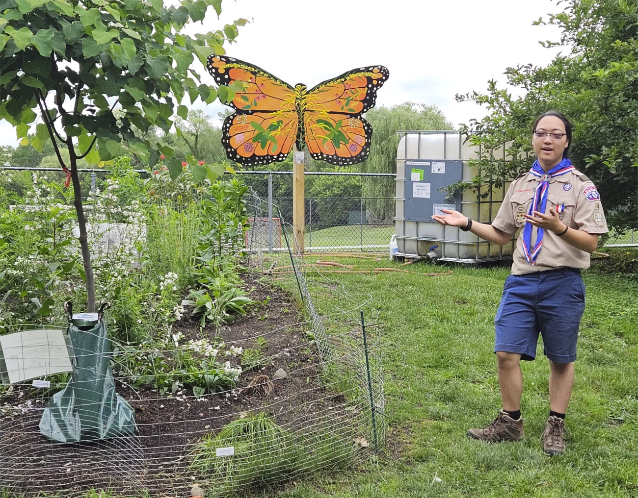 Complementing the pollinator garden is one of Newton’s public art installations in the series Flutter — a butterfly sculpture created by artist Jenn Houle.
