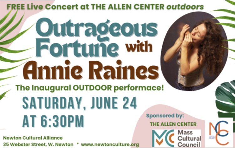 The Allen Center presents the Inaugural Concert for Allen Center Outdoors – a summer series of outdoor programs on the grounds of The Allen Center (35 Webster Street, West Newton) — FREE and open to the public! Advance registration is recommended. The fabulous Boston-based early jazz & acoustic blues jug band, Outrageous Fortune, led by guitarist Chris Welles, is famous for its colorful sound and sweet harmonies. On this occasion, the group will be joined by Newton’s own Annie Raines who is best known as a harmonicist. Seating is limited. Sponsored in part by the Newton Cultural Council.