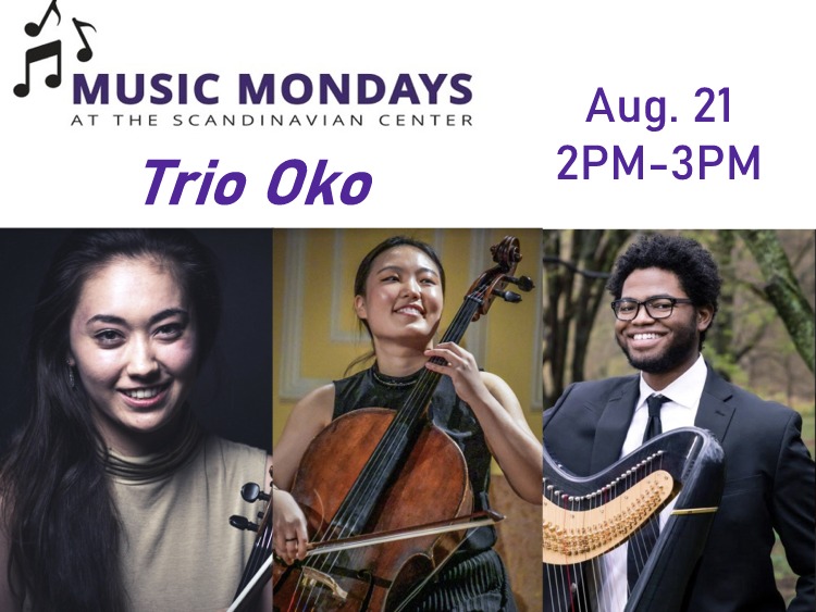 Music Mondays is a women-run nonprofit presenting frequent, live music concerts in the Scandinavian Living Center’s Nordic Hall (206 Waltham Street, West Newton) to audiences of mostly senior citizens. On August 21, 2PM-3PM, it will present a free concert by Trio Oko — violinist Emma Powell, cellist Mina Kim, and harpist Charles Overton…