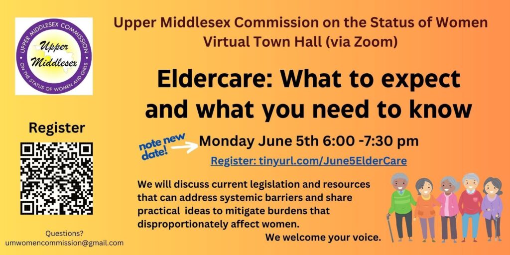 The Upper Middlesex Commission on the Status of Women is hosting a Virtual Town Hall on Eldercare: “What to expect and what you need to know” on Monday, June 5, 2023, from 6PM – 7:30PM (see Flyer). The event will bring together experts and state legislators to discuss current legislation…
