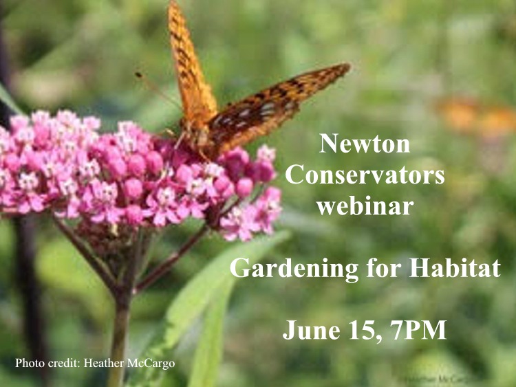 Newton Conservators will present a webinar, Gardening for Habitat, June 15 at 7PM, about what you can do in your garden to encourage pollinators and other beneficial wildlife. Emily Baisden of the Wild Seed Project will will explain how to create habitat in the garden year-round while balancing your workload…