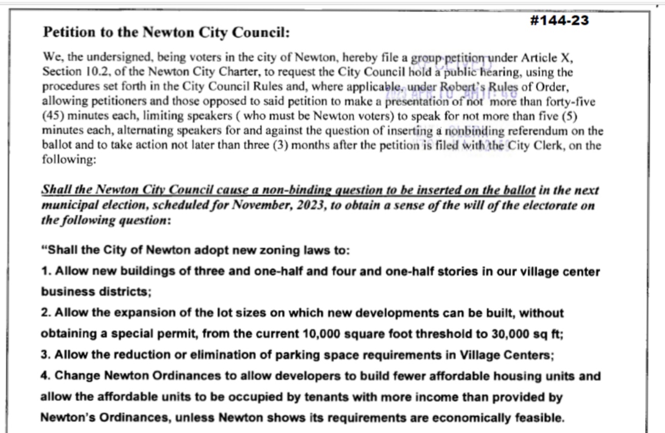 In introducing the petition, Mr. Harrington, a former Vice President of the Board of Aldermen, offered to “tweak” the ballot language to address the concerns of the Planning Department. He and others complained that the Council and the Planning Department have not engaged in sufficient outreach. He was critical of the MBTA Communities Act in dictating local requirements, and he urged the Council “to allow the voters to express their opinion, then you can do what you will.”