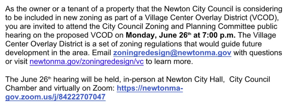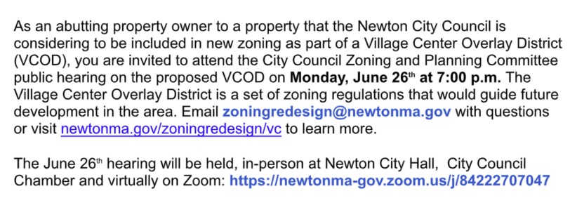As reported in last week’s Fig City News, the Programs and Services Committee held a public hearing on a petition filed by Peter Harrington and more than fifty Newton residents, asking to place a non-binding question on the November ballot dealing with several aspects of Newton’s Village Center Zoning Redesign project. In advance of the meeting, the Newton Planning Department issued a memo refuting several of the assertions in the ballot question, concluding that “This proposed ballot question misrepresents the current VCOD (Village Center Overlay Design) proposal and conflates several distinct issues into one question. As a result, the proposed query may increase confusion regarding the VCOD.” The Planning Department recommended that the Committee vote “No Action Necessary.”