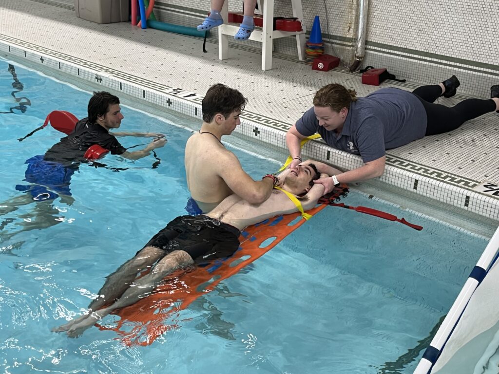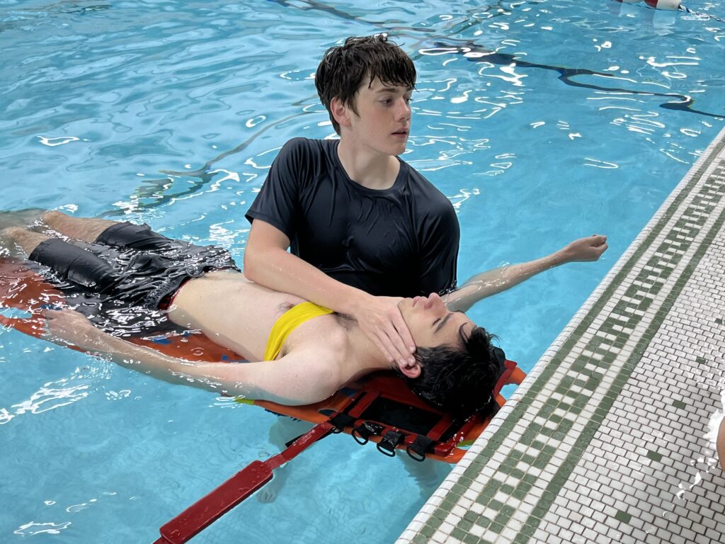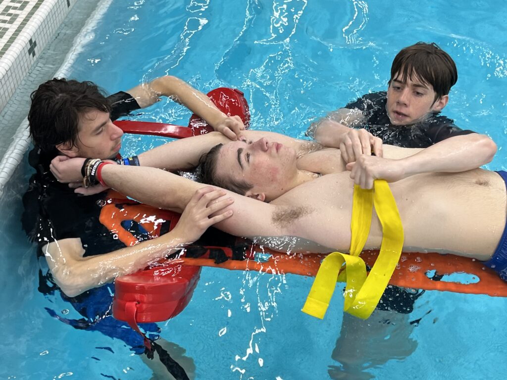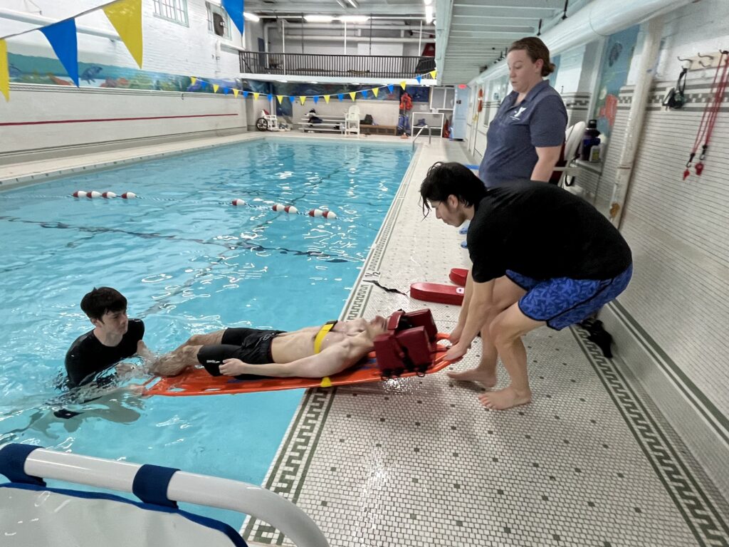 During a recent session at the Y’s Church Street branch, Barker instructed the all-teen class how to properly secure an unconscious person to a board to stabilize their body. Once the “victim” was secured, Barker instructed the teens how to coordinate their efforts to hoist him – board and all – onto the pool deck.