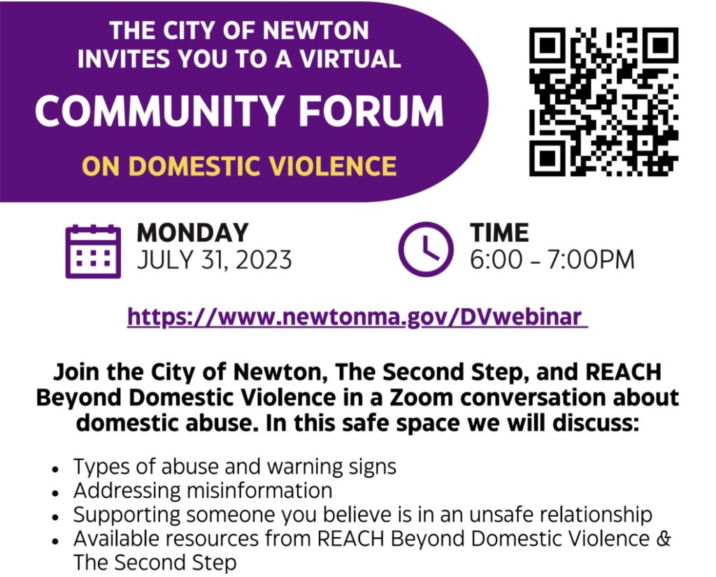 In the wake of the tragic death of Nancy Hanson of Newton due to domestic violence homicide, the City of Newton, The Second Step, and REACH Beyond Domestic Violence will jointly host an online Community Forum on Domestic Violence on Monday, July 31, 6PM-7PM (Zoom link). The event is free,…