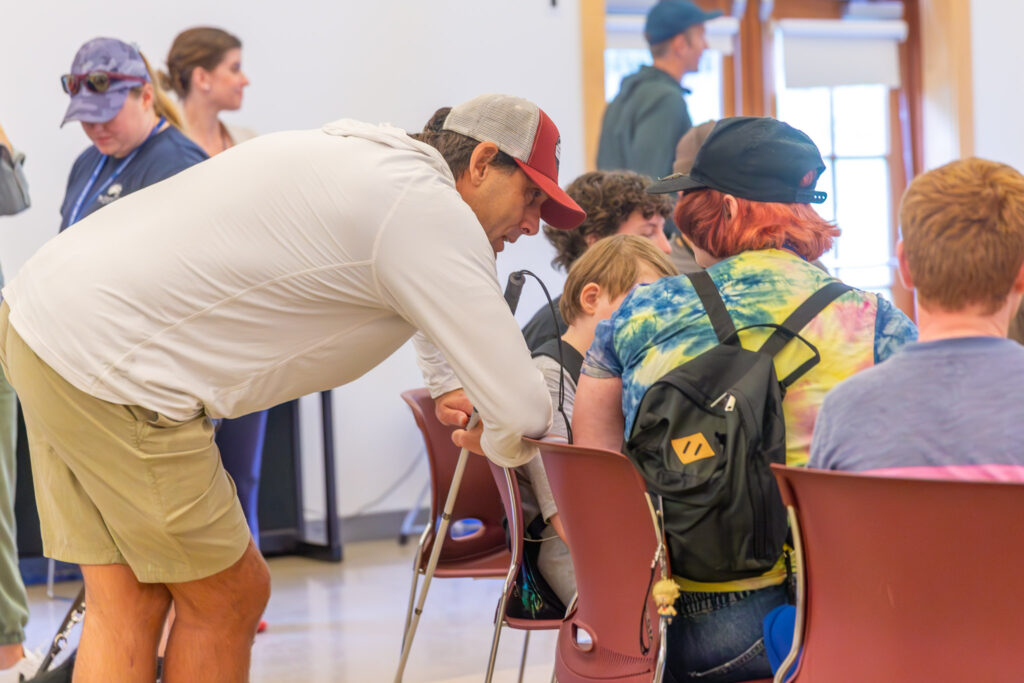 A Carroll Center student described having written a report on Weihenmayer and Ray Charles as being particularly gifted. Weihenmayer replied, “I don’t know that I’m gifted; I think I’m stubborn. …We all come with a certain set of tools; you just need to dip into your toolkit. Coming here this week will enhance your toolkit.” His assistant shared the quote: “Everyone is a genius. But if you try to teach a fish to climb a tree, he will fail. And he will go his whole life thinking he’s stupid…we are each unique.”