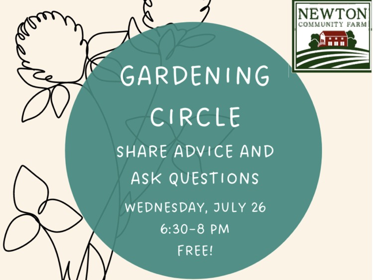 Newton Community Farm will hold a Gardening Circle on Wednesday, July 26, at 6:30PM-8PM at the Farm. The public is invited to share successes and challenges gardening and help build a strong community of local gardeners. Bring ideas, questions, suggestions, advice, and stories and help fellow gardeners in their gardening…