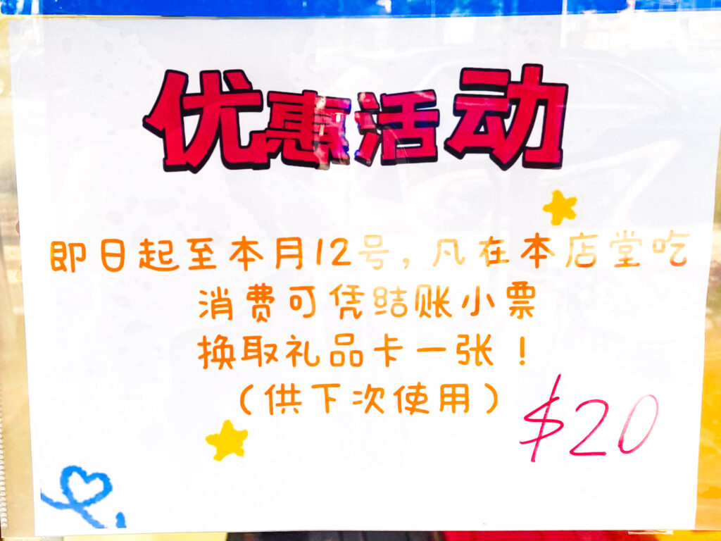 The reopening was announced with a sign on the front door last Thursday. Tuesday evening, patrons could be seen eating, and a new sign speaks of a promotion — from now until the 12th of this month for “anyone who eats in our store, consumption can be made with the checkout receipt. Redeem a gift card (for next use) $20” (per Google Translate).