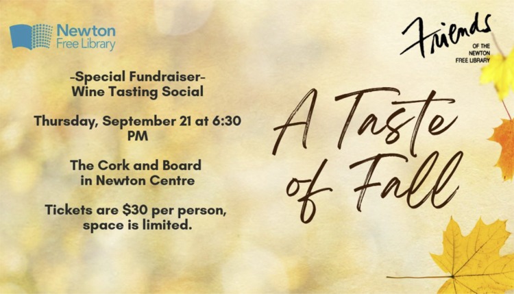 The Friends of the Newton Free Library will host a Wine Tasting fundraiser at The Cork and Board (Centre Street, Newton Centre) on Thursday, September 21, 6:30PM-8PM. Tickets are $30 per person and include wine tasting and charcuterie snacks. All proceeds will benefit The Friends of the Newton Free Library,…